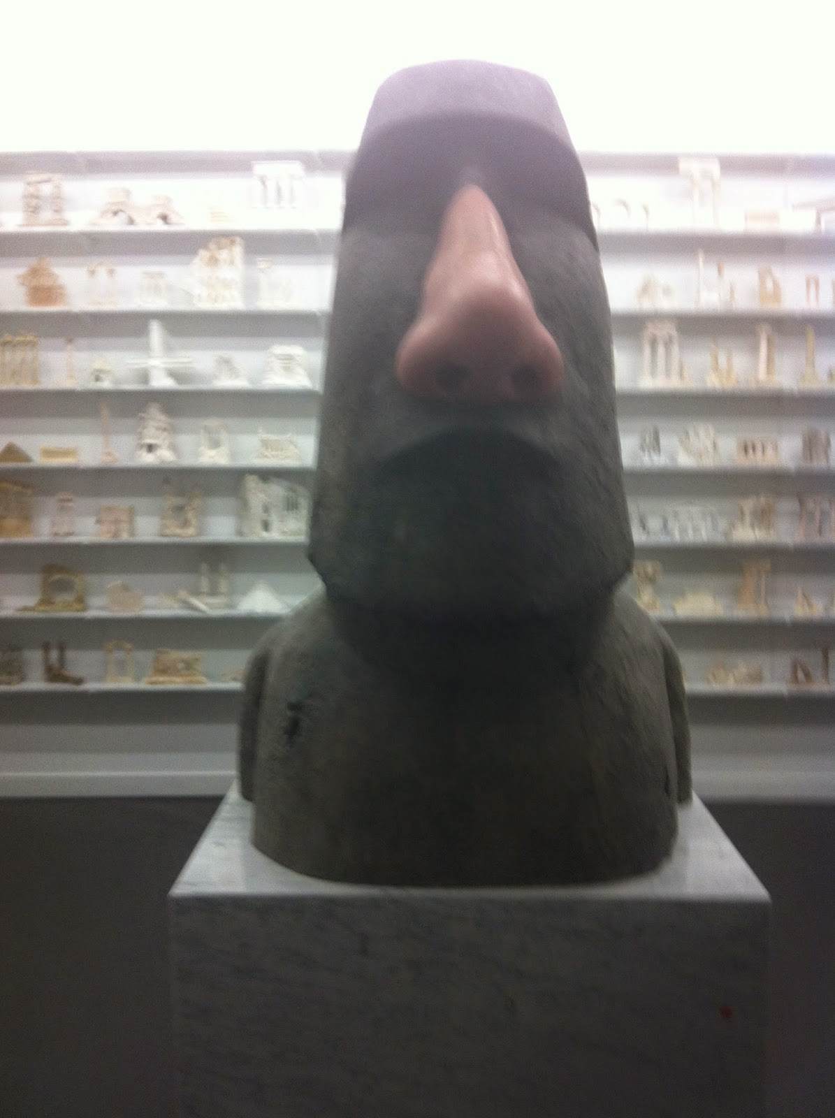 Et pour finir, j'ai comme envie de sélectionner mon propre choix de la section Prix Marcel Duchamp parmi les artistes nommés pour l'édition 2014. Il s'agit de l'installation de Théo Mercier mettant en scène des ruines de monuments issus des tréfonds de nos aquariums avec une immense sculpture façon île de Pâques en préambule. Des ruines de monuments pas vraiment bien reproduits, pas toujours existants qui sont eux mêmes en ruine, un peu comme une tautologie. Altérés par une vie aquatique apparemment trépidante, certains petits objets ont en effet muté sous l'eau. Des choses se sont installées sur eux, des choses ont poussé... La taille de tous ces petits objets posés sur des étagères de marbre contraste allégrement avec la monumentalité de la statue primitive au premier plan. L'artiste lui a posé un nez organique où même les nervures et microparticules de la peau sont visibles (et les poils aussi). La civilisation primitive prendrait-elle le dessus sur nos civilisations ultra modernes... et en ruines ? D'aucuns tombent amoureux de rocks stars, moi ma rock star de cette Fiac 2014 c'est lui : Théo Mercier.